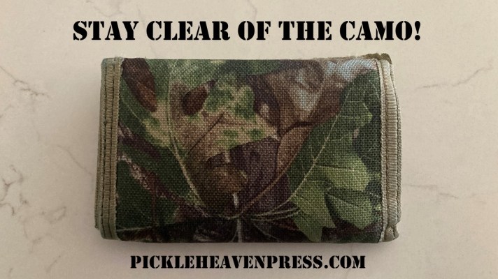 I am fairly cheap so I bought the cheapest wallet I could find – one made of nylon and Velcro. It was inexpensive cause it had a camouflage design to it. Which is why I can’t find it when I need it. (Although neither can a pickpocket!)