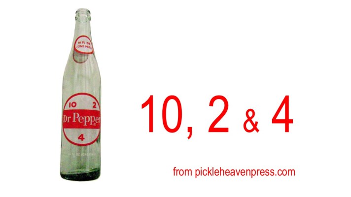 But the man was drinking 60 ounces of Dr. Pepper each day.  And yet, he was pushing ninety at that time, still working every day, slim and trim, fantastic health – even had good teeth.  So, I’m no dummy.  I began my own 10, 2 and 4 regimen  (though it has not worked out as well for me).