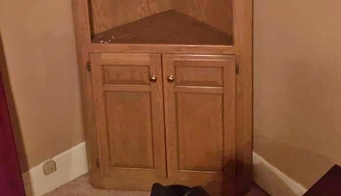 There, on the carpet, was a perfectly formed, filthy, black triangle where the cabinet had stood.  It looked a giant rug tattoo.  The cabinet had clearly not been moved for many years.